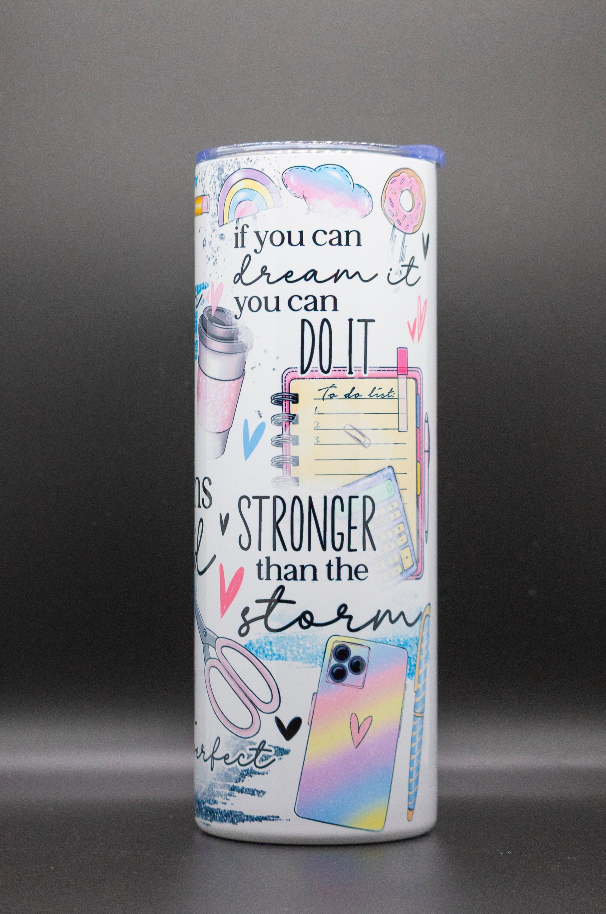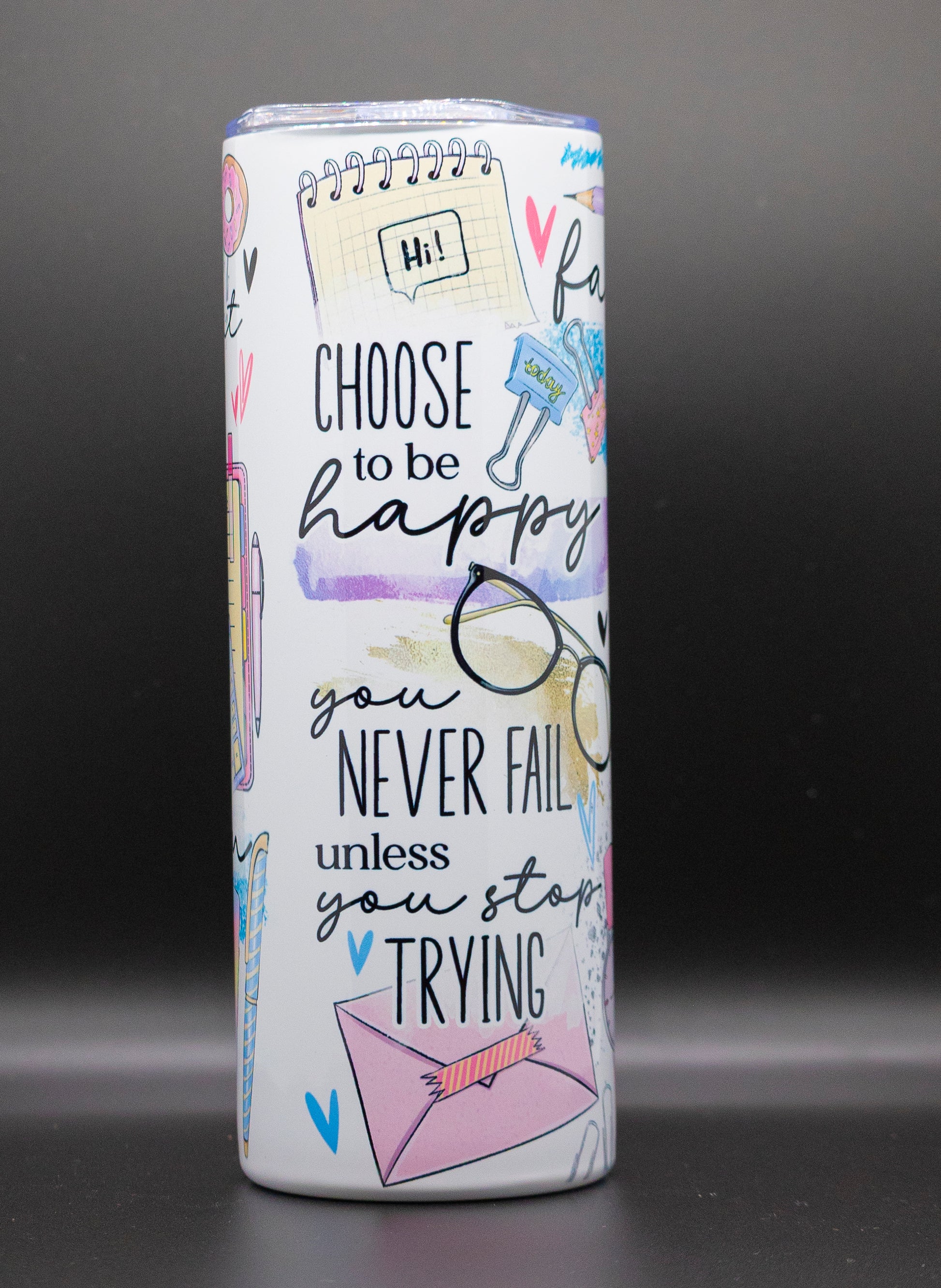 20oz Full wrap sublimated tumbler. Includes stainless steel straw and clear lid.